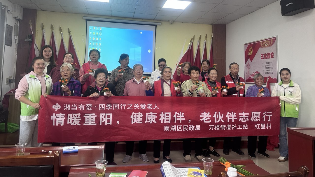 10月28日上午,萬樓街道社工站在紅星村開展 “湘當(dāng)有愛?四季同行之關(guān)愛老人 —— 情暖重陽,健康相伴,老伙伴志愿行” 主題活動(dòng)。社工鏈接衛(wèi)生院為50余名60歲以上的老人們搭建起便捷健康服務(wù)平臺(tái),醫(yī)護(hù)人員為老人測量血壓、解答健康疑問,提供專業(yè)醫(yī)療建議。與此同時(shí),扭扭棒手工制作區(qū)熱鬧非凡,色彩各異的扭扭棒在老人們手中變成花朵、小動(dòng)物等創(chuàng)意造型,讓老人們在體驗(yàn)手工樂趣的同時(shí),收獲健康關(guān)懷。