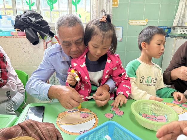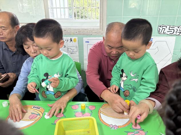 孩子們與爺爺奶奶一同巧手創(chuàng)作,將剪好的彩色壽桃精心貼在畫好的籃子中,共同完成了一幅幅“福壽滿籃”的拼貼畫。每一幅作品都充滿了童真與祝福,象征著健康長壽的美好寓意,也承載著濃濃的祖孫情。
